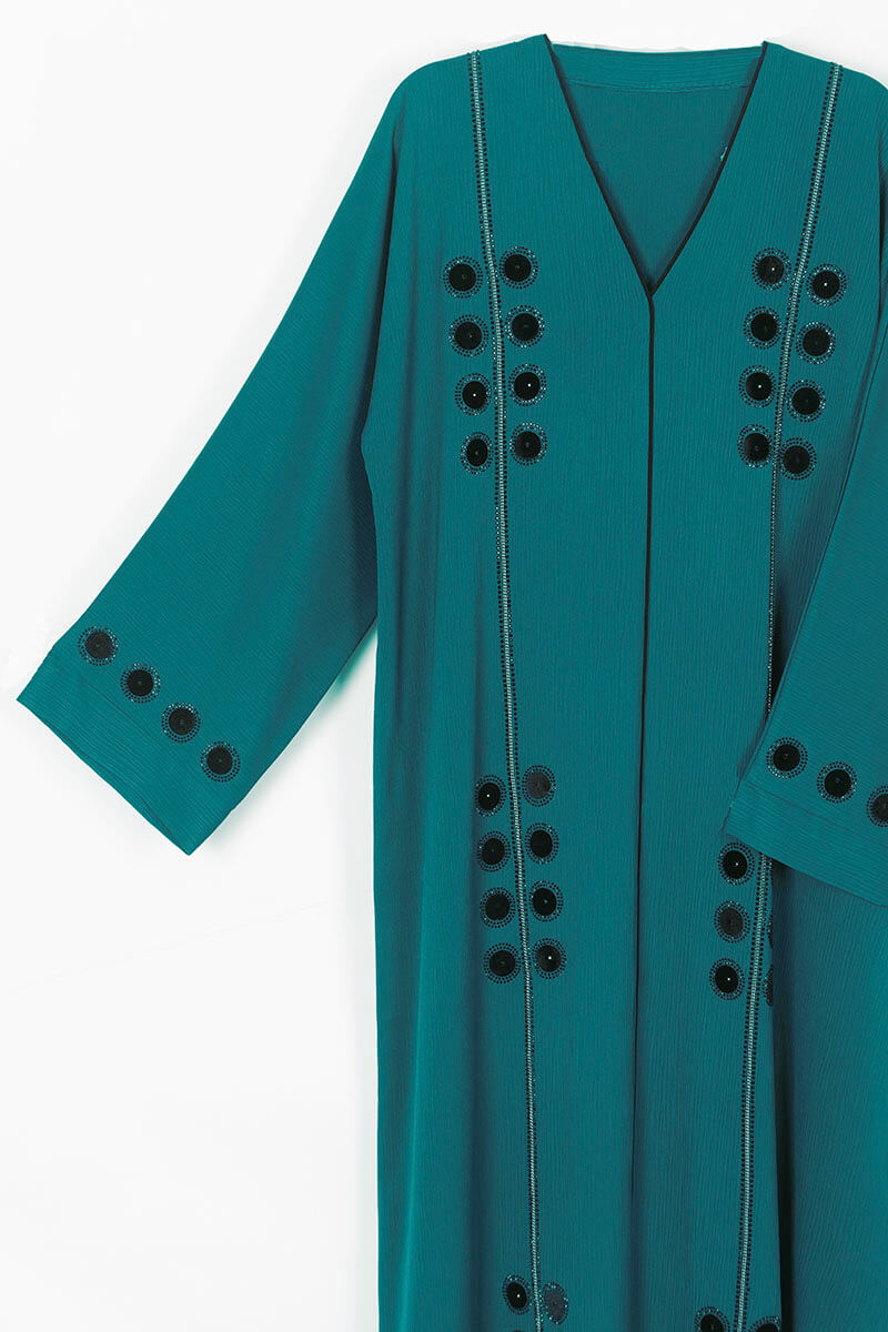 Stunning Teal Colored Abaya, with beautiful sequined parallel lines along the front, with piping details. The sequin line work is in between circular shaped velvet details over the front of the Abaya, as well as the sleeve’s hemline.Â